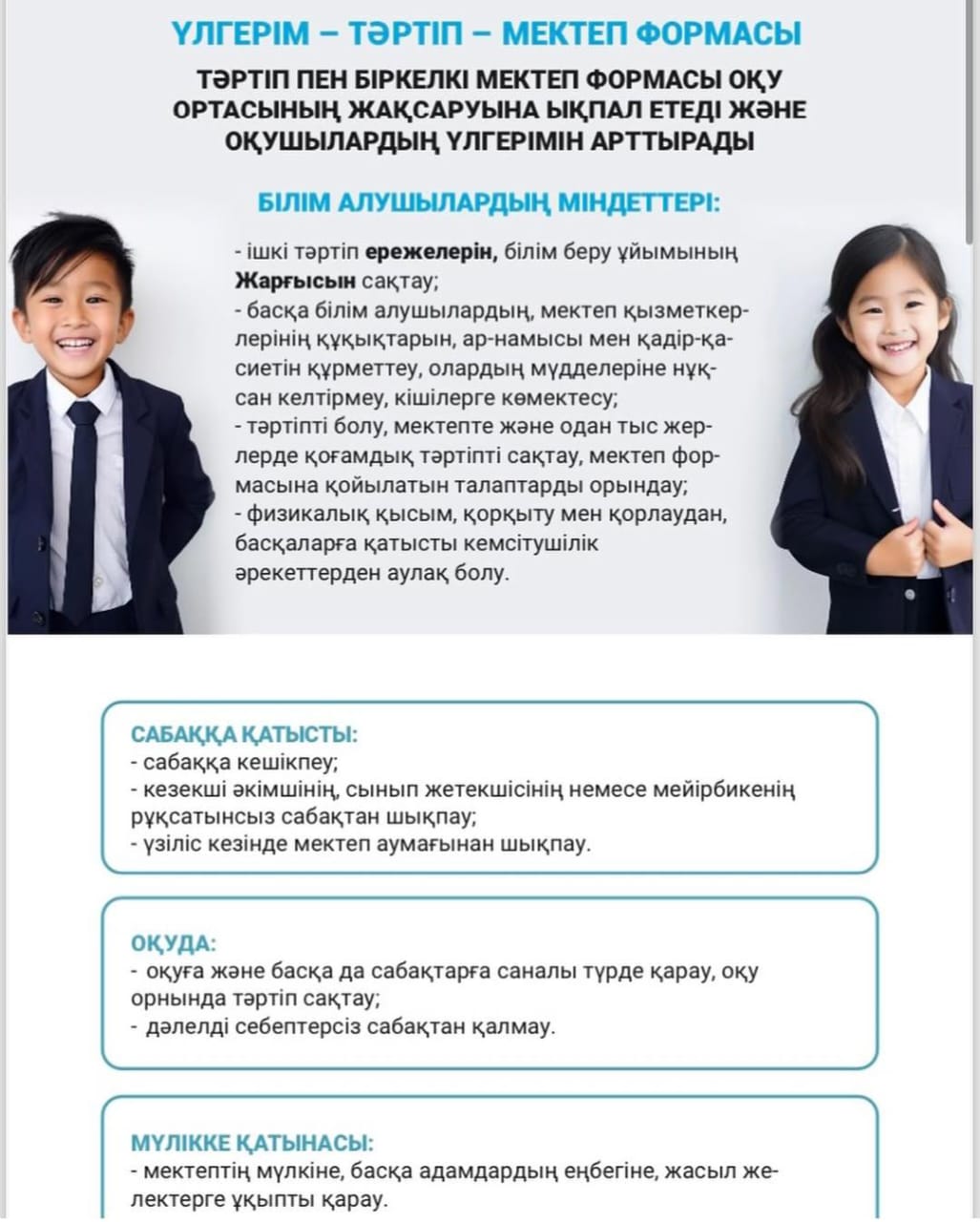 Мектептің ішкі мәдениетін дамытудың бағыттарының бірі, ол мектеп бойынша бірыңғай киім үлгісіне өту (көшу)Оқушылар үшін бірыңғай мектеп формасы - оқушыны тәртіпке шақыра отырып, әлеуметтік теңсіздік пен бәсекелестікті болдырмайтын, балалар мен жасөспірімдер арасындағы еліктегіштік алдын алатын, ата-аналар үшін қолжетімді заманауи киім үлгісі. Орта білім беру ұйымдары үшін міндетті мектеп формасына қойылатын талаптарды бекіту туралы ҚР Білім және ғылым министрінің 2016 жылғы 14 қаңтардағы № 26 бұйрығы негізінде мектептің жалпы ата-аналар жиналысында келесі 2024-2025 оқу жылына мектепте оқушыларға бірыңғай мектеп формасын жаңарту туралы мәселе қаралып, ата-аналар тарапынан бірауыздан қолдау тапты