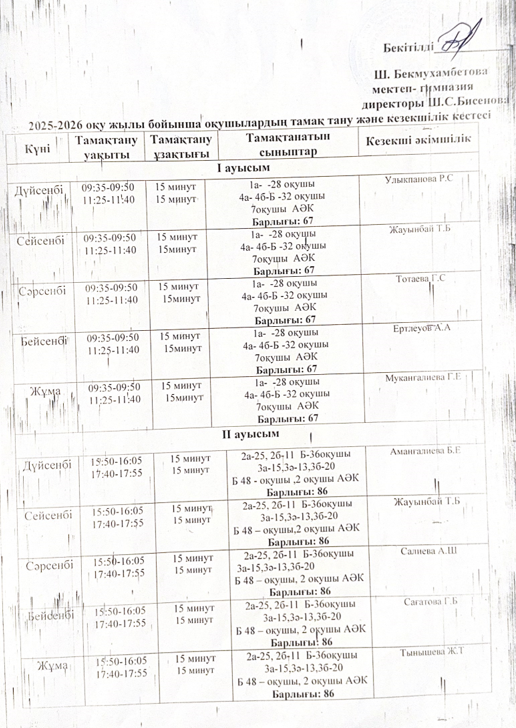 2025-2026 оқу жылы бойынша оқушылардың тамақ тану және кезекшілік кестесі жарияланды.